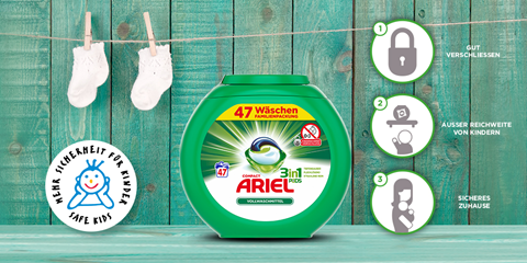 Ariel ist Partner von BAG Mehr Sicherheit für Kinder der führenden bundesweit tätigen Organisation, die sich der Unfallprävention und Sicherheitsförderung von Kindern widmet. Gemeinsam setzen sich Ariel und BAG für den sicheren Gebrauch von Waschmitteln ein. Mehr Infos unter: www.kindersicherheit.de