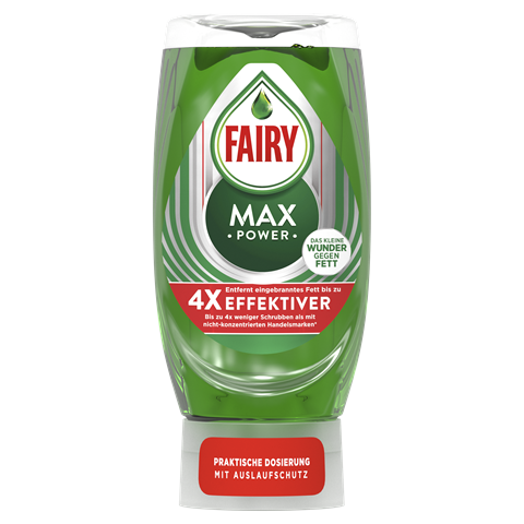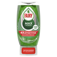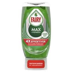 Die geniale, kopfstehende Flasche des Fairy Max Power macht das Dosieren bis zum letzten Tropfen denkbar einfach. Der innovative Verschluss ganz ohne Kappe ermöglicht eine einhändige Bedienung und sorgt dafür, dass nichts verschmiert. Das Spülmittel lässt sich mit leichtem Druck auf die Flasche ganz einfach dosieren. Das ist smartes Spülen – einfach und schnell, bis zum letzten Tropfen. Und weil es auch auf die inneren Werte ankommt, überzeugt Fairy Max Power mit einer neuen Formulierung, die eingebranntes Fett bis zu vier Mal effektiver entfernt. Das bedeutet: Bis zu vier Mal weniger Schrubben als mit nicht-konzentrierten Handelsmarken (bezieht sich auf 1-Liter-Flaschen mit empfohlener Dosierung von 4 ml auf 5 Liter Spülwasser oder mehr). Das Geschirr wird glänzend sauber – sogar bei energiesparend niedrigen Temperaturen.