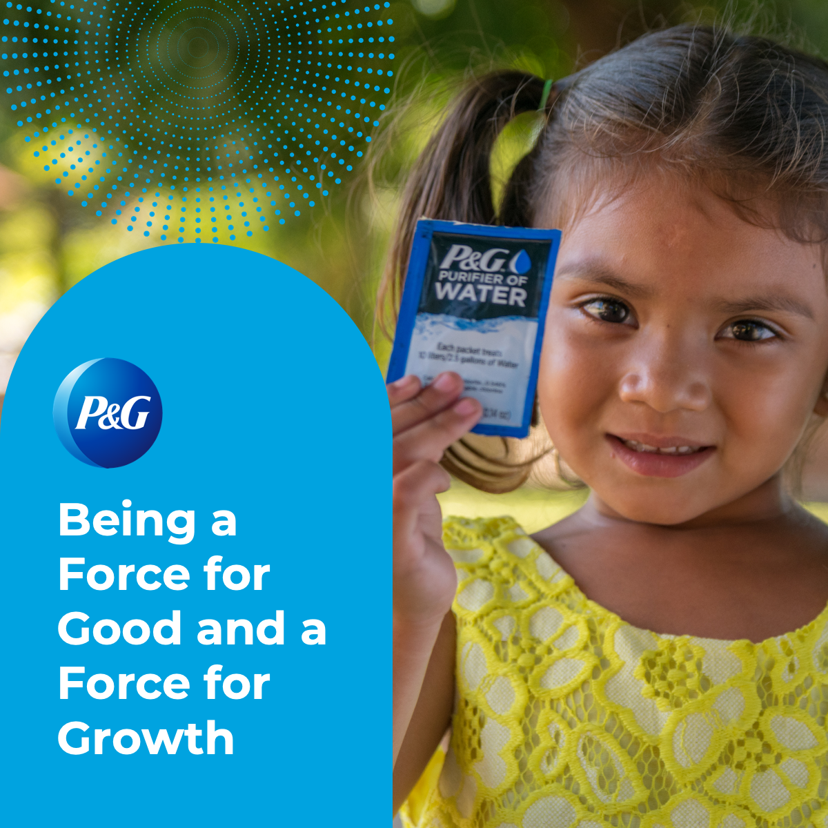 Im Jahr 2004 haben wir das Programm für sauberes Trinkwasser für Kinder ins Leben gerufen, das mit einer einfachen Technologie 10 Liter verschmutztes, möglicherweise potentiell krankmachendes Wasser in nur 30 Minuten mit einem Eimer, einem Schöpflöffel, einem Tuch und einem P&G Wasseraufbereitungssachet reinigt. Die Wasserreinigungssachets wurden von P&G-Wissenschaftlern entwickelt .