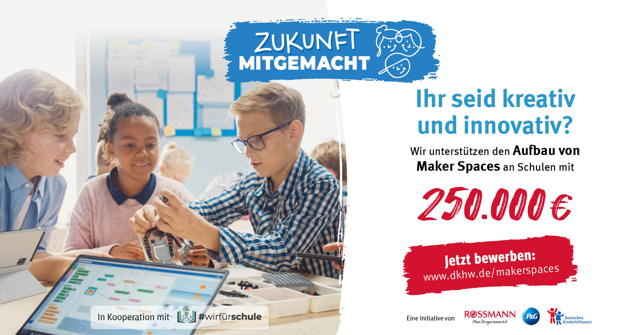 Das Deutsche Kinderhilfswerk, ROSSMANN und Procter & Gamble fördern unter dem Dach der Initiative „Zukunft mitgemacht“ deutschlandweit in Schulen die Einrichtung von offenen Lernräumen, die dem projektorientierten, experimentellen und kreativen Arbeiten dienen – sogenannte Maker Spaces. Diese neue Förderinitiative wurde beim „PxP Festival – Schule feiert Zukunft“ einem breiten Publikum von Schülerinnen und Schülern sowie Lehrerinnen und Lehrern erstmals vorgestellt. Ab heute kann sich jede interessierte Schule auf www.dkhw.de/makerspaces bewerben. Die Gesamtfördersumme der Aktion beträgt 250.000 Euro, verteilt auf 22 Projekte. Die Hauptförderung ist mit 30.000 Euro dotiert. Unterstützt werden die Schulen bei der Projektrealisierung von der Initiative #wirfürschule.