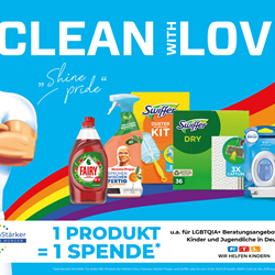 Im Rahmen von #CleanWithLove können Konsument:innen vom 01.05 bis zum 15.07.2023 durch den Kauf von Produkten der teilnehmenden Marken Fairy, Febreze, Meister Proper und Swiffer Spenden generieren und die LGBTQIA+ Community damit unterstützen. Für jedes gekaufte P&G Produkt fließt 1 Cent durch P&G an die „Stiftung RTL – Wir helfen Kindern e.V.“. Diese Spenden kommen u. a. ausgewählten LGBTQIA+ Beratungsangeboten in Deutschland zugute. Spendenziel sind 190.000 Euro.