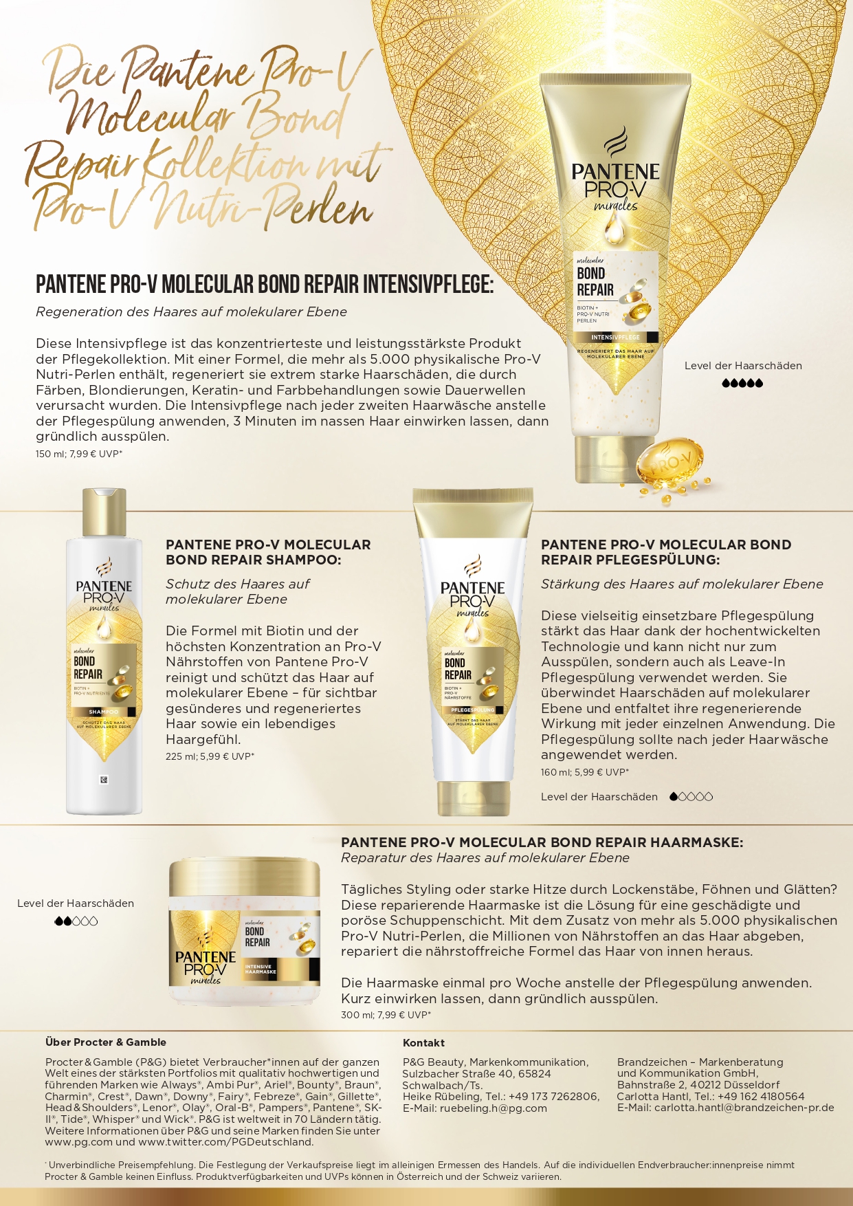 Schwalbach am Taunus, Januar 2024. Wir alle streben nach gesund und lebendig aussehendem Haar. Die Haargesundheitsexpert:innen von Pantene Pro-V bringen uns diesem Ziel ab Februar 2024 ein Stück näher. Mit ihrer jahrzehntelangen Erfahrung in der Forschung und Entwicklung von Haarpflegeprodukten haben sie die bewährte Pro-V Formel weiter verfeinert. Das Ergebnis ist die neue Pantene Pro-V Molecular Bond Repair Pflegekollektion mit Pro-V Nutri-Perlen, eine moderne Lösung für Haare, die unter alltäglichen Schäden wie Glätten und Styling bis hin zu schweren Schäden durch Blondierungen, Keratin- und Farbbehandlungen leiden. Sie regeneriert das Haar auf molekularer Ebene und rekonstruiert gebrochene Haarverbindungen, um das Haar vom Ansatz bis in die Spitzen zu pflegen. Shampoo und Pflegespülung sowie die mit je 5.000 Pro-V Nutri-Perlen angereicherte Haarmaske und Intensivpflege machen alle sichtbaren Anzeichen von Haarschäden rückgängig und sorgen so für gesund aussehendes Haar und ein lebendiges Haargefühl. Die Produkte sind für alle Haartypen geeignet – besonders für sehr stark geschädigtes Haar. Sie wurden entwickelt, um das Haar zu regenerieren und von innen heraus zu stärken.